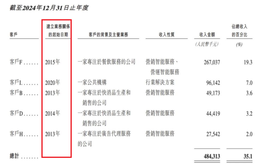 从数据上看,新的趋势照旧对明略科技的营收带来了冲击。2024年,其五大客户共孝顺了4.84亿元,同比减少7.98%。值得防卫的是,其中的四家公司王人是在2015年之前建设的协作商量,仅有一家是2020年的新协作。